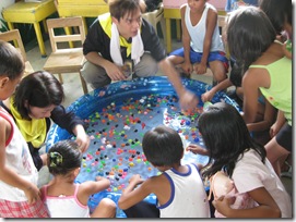 之後有當地的菲律賓人幫我們打水過來,我們把水池裝水,接著就是把super ball、小玩偶丟到水池裡,再把我們的動線規劃好,要送的獎品都先排出來!